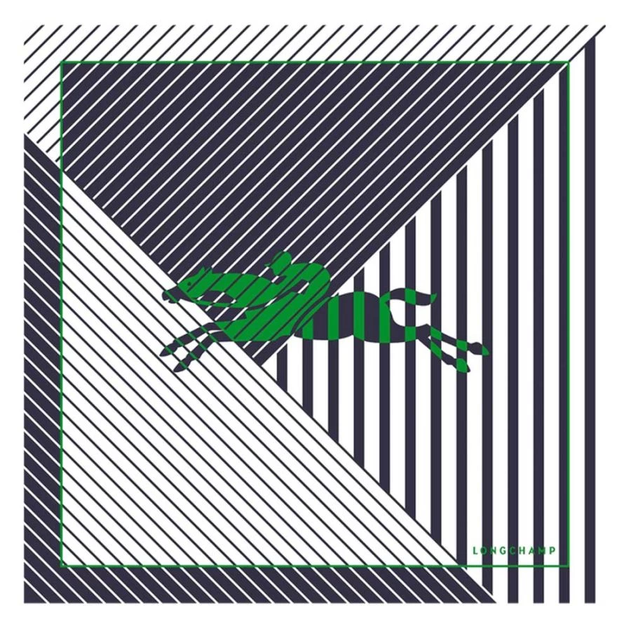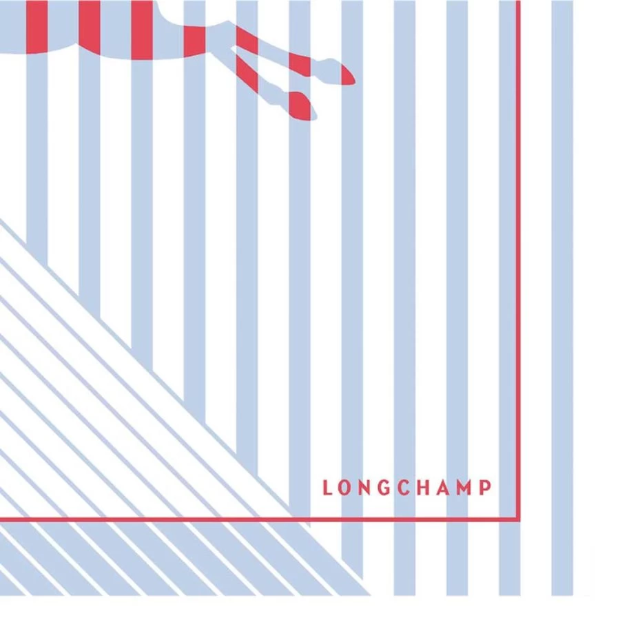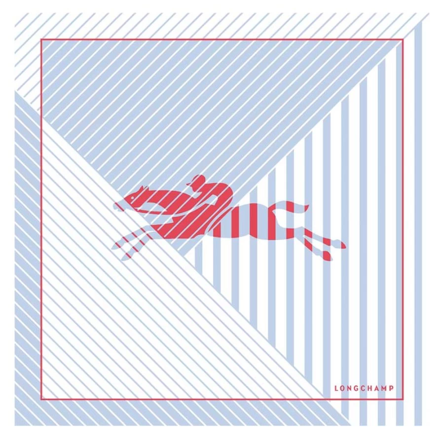 Ce carré de soie Longchamp est animé par un jeu visuel graphique et dynamique mettant en évidence l’imprimé marinière.