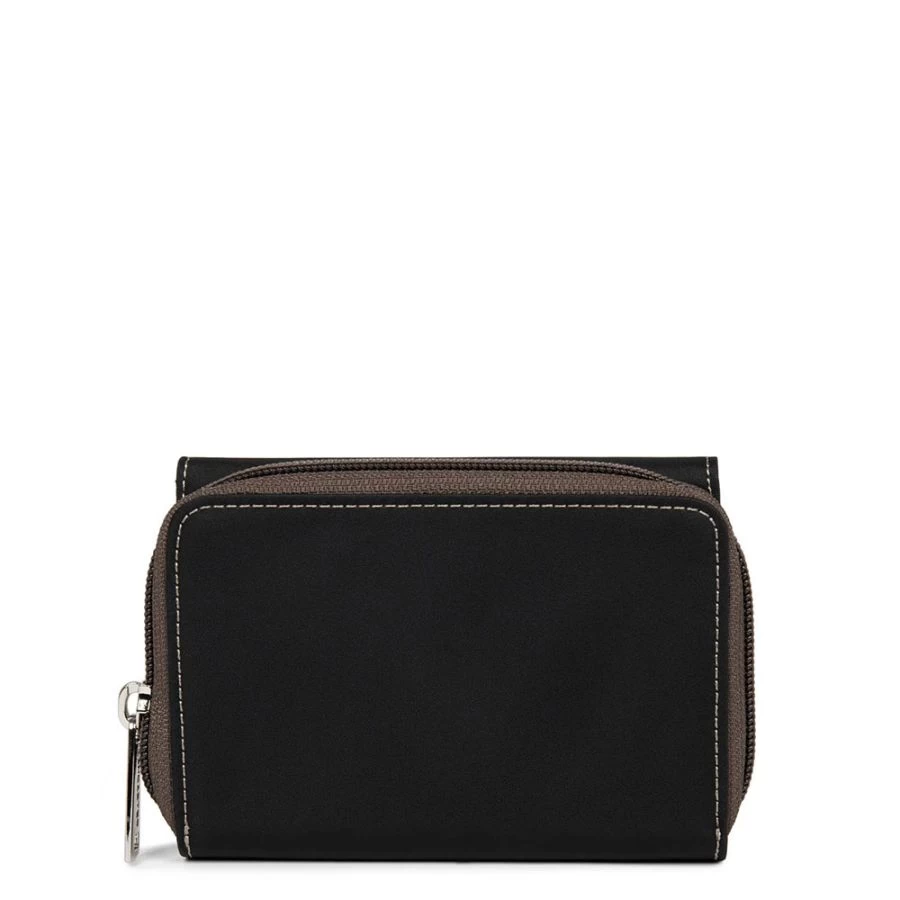 – l’autre compartiment se ferme à l’aide d’une glissière et dispose de deux soufflets séparés par une poche zippée pour la monnaie.