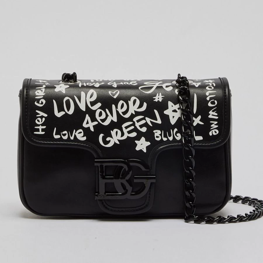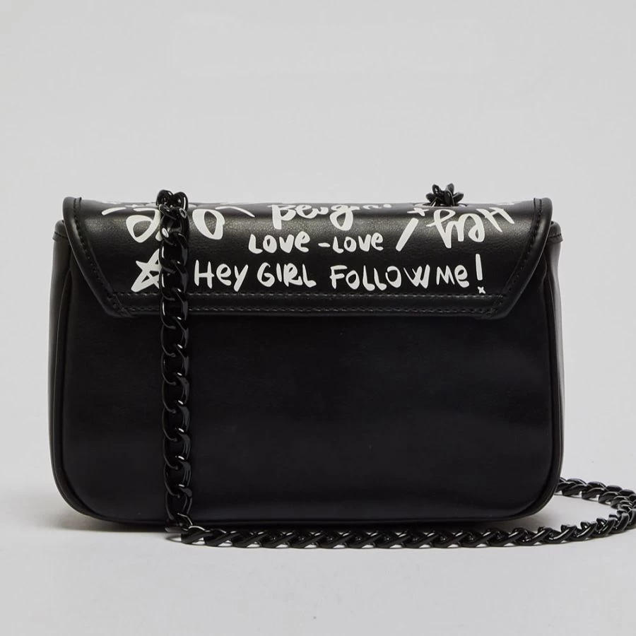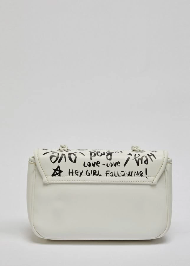 Chic à souhait, ce petit sac bandoulière est orné de graffitis contrastants, d’un rabat et des initiales du logo en métal.