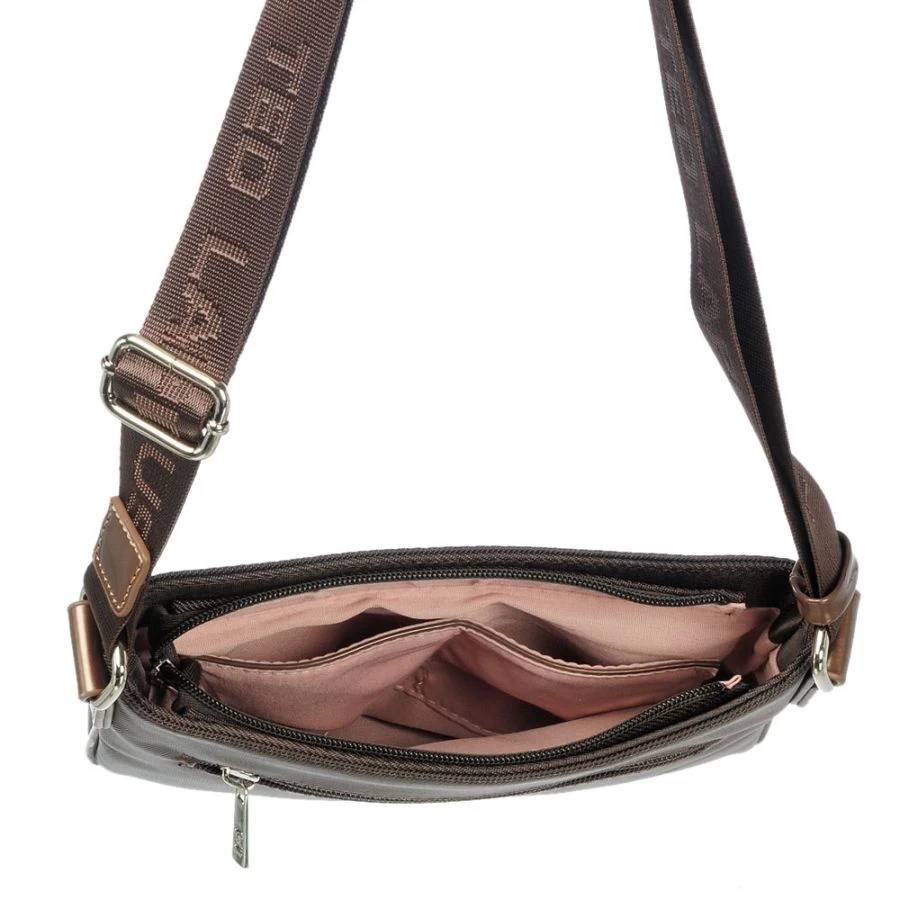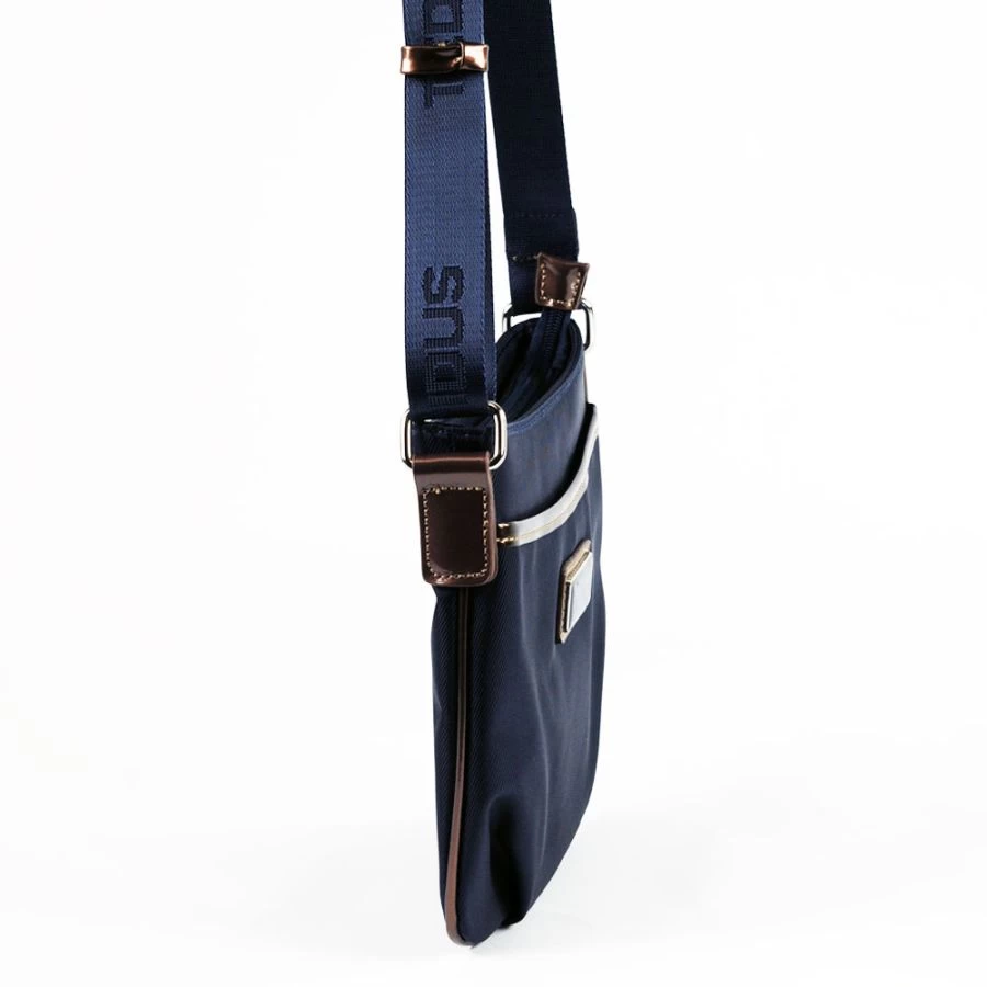 A l’extérieur, une poche avant à top magnétique et une poche arrière à zip. Bandoulière ajustable.