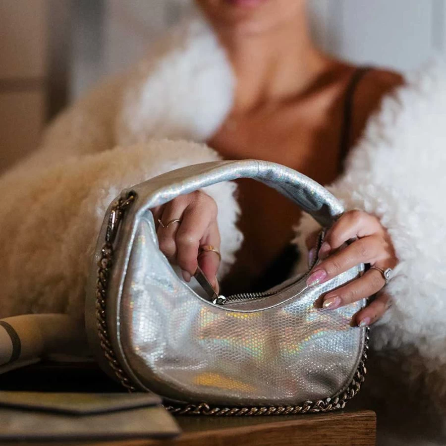 Il se porte à l’épaule avec sa bandoulière en chaine ou à la main.