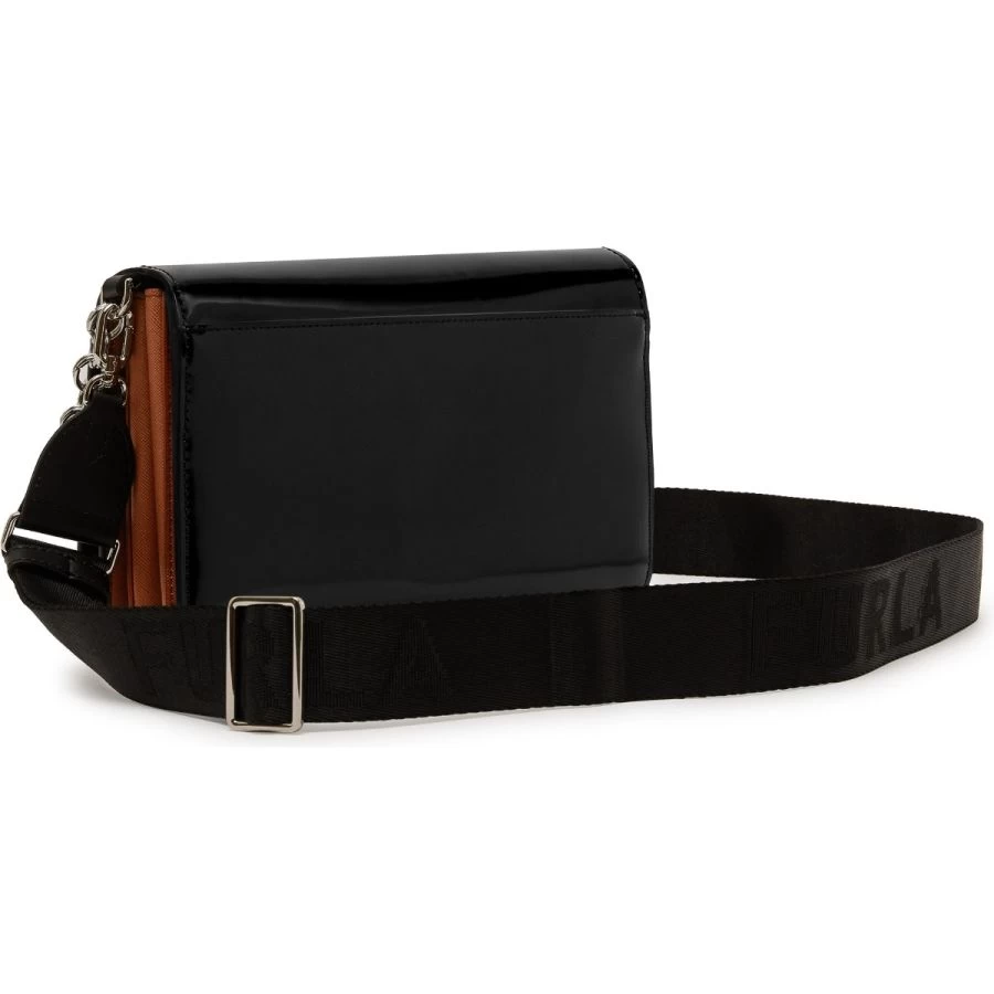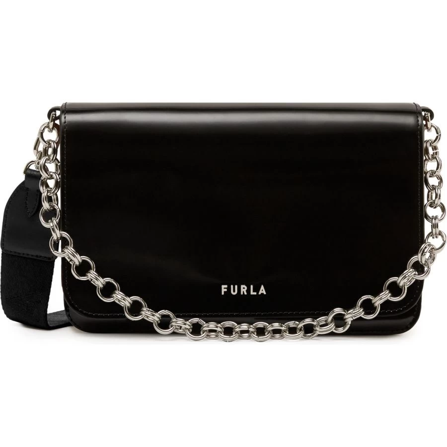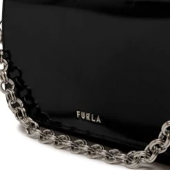 Il est doté d’une double bandoulière : la première est une chaîne fixe en métal, et la seconde est en gros-grain personnalisée avec le logo Furla, ajustable et amovible, pour porter confortablement à l’épaule ou en bandoulière.