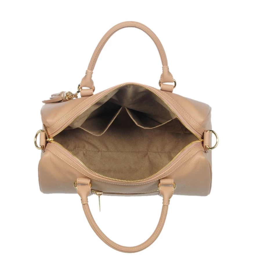 L’extérieur est doté d’une poche dorsale, d’une bandoulière ajustable et amovible pour le mettre en travers sur l’épaule et d’une paire d’anses pour porter le sac à la main.