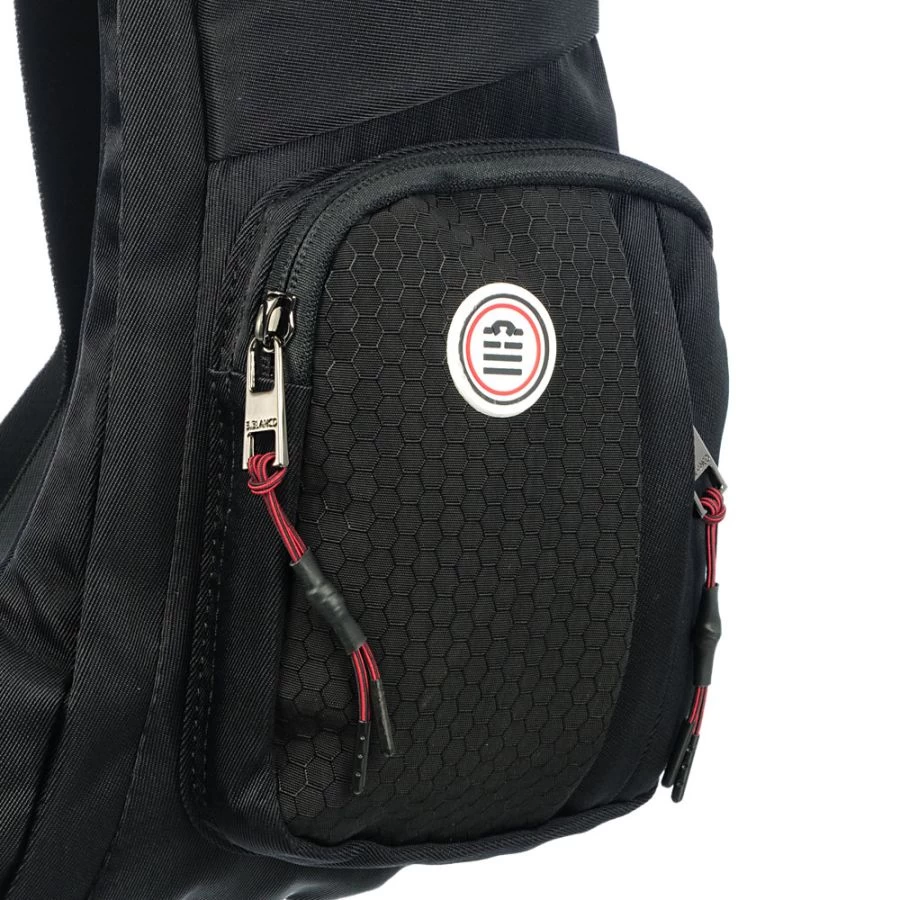 A l’avant, une poche avec rabat et deux poches zippées en supplément pour les petites choses comme des clés…