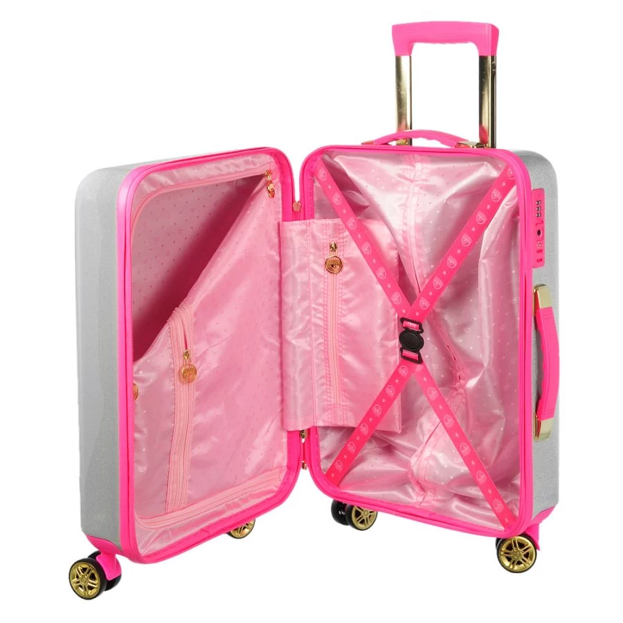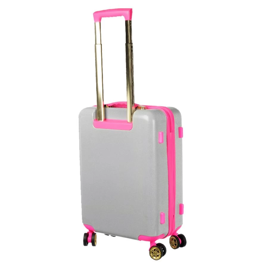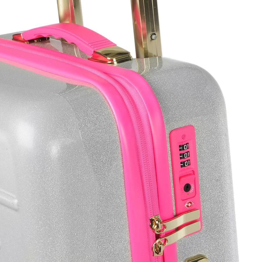 Une valise « girly » à souhait, argent pailleté avec détails rose fluo et dorés.